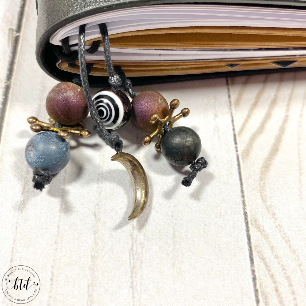 To make the dangle page markers I used pieces from The 1407 Planners Diamonds in the Sky kit. All I needed to do was use longer cording to fit the travelers notebook length. I created two page markers, the first has a silver moon charm paired with an “orbit” bead (as I like to call it); the second holds stacked “lunar crater” beads with a metal starburst between them. Both fit like a “charm”!