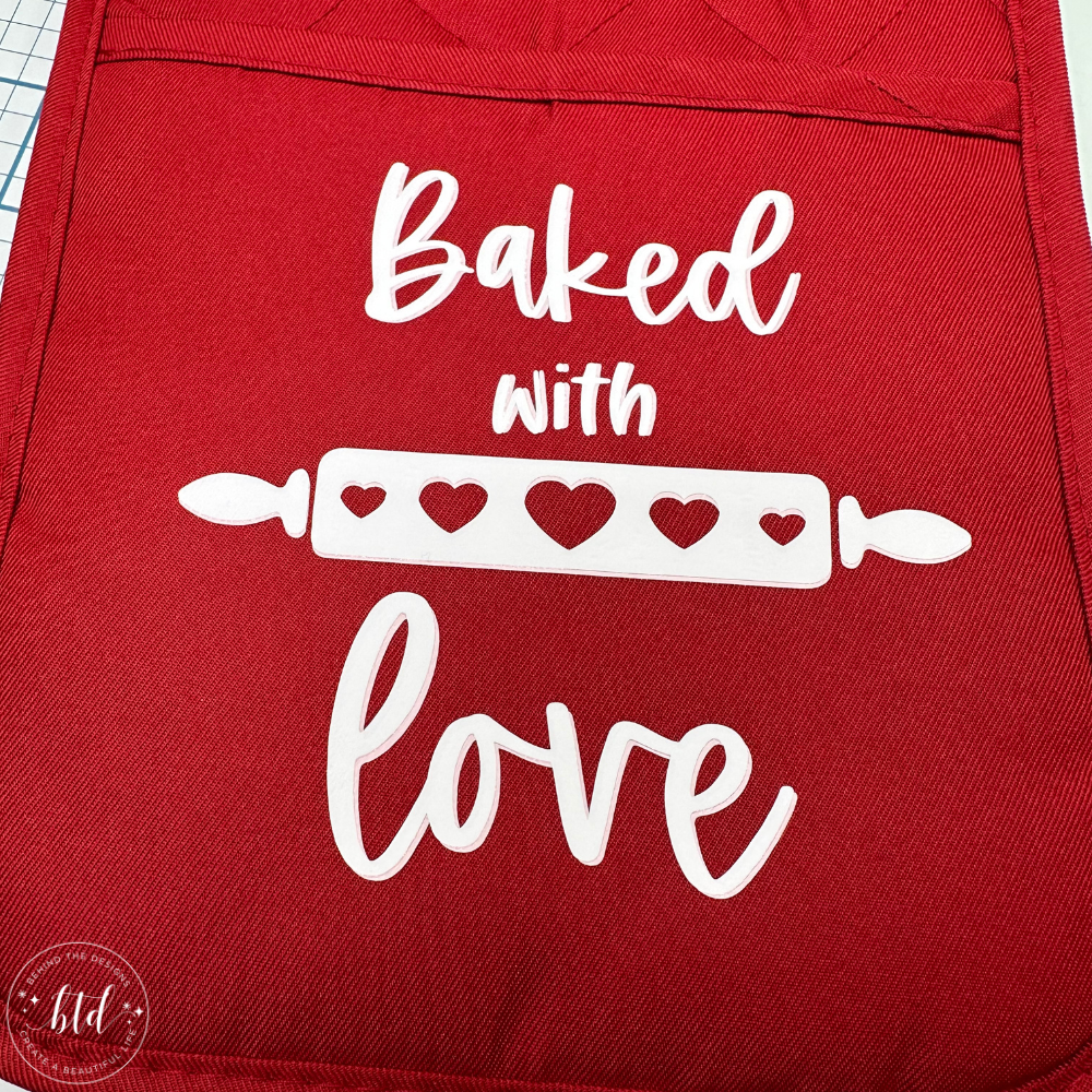 You can clearly see from the image above the pink vinyl shadow layer is barely visible. This Valentine Baked With Love Oven Mitt still came out beautifully, even with the not so great shadow color!