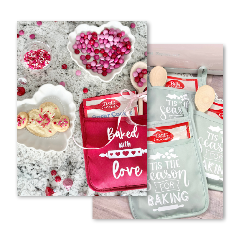 The best part is you can fill them with any dessert baking packet you’d like. In fact, I also found the cookie and brownie baking packets from Dollar Tree fit perfectly inside these oven mitts. All you have to do is cut, weed and iron-on your Cricut vinyl!