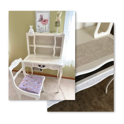 Giving old furniture a fresh new look is an exciting project to take on; plus it’s good for the environment! See how I turned this tired old desk from a drab brown to an heirloom white using spray paint and decoupage. It’s perfect to use as as desk or a girls vanity!