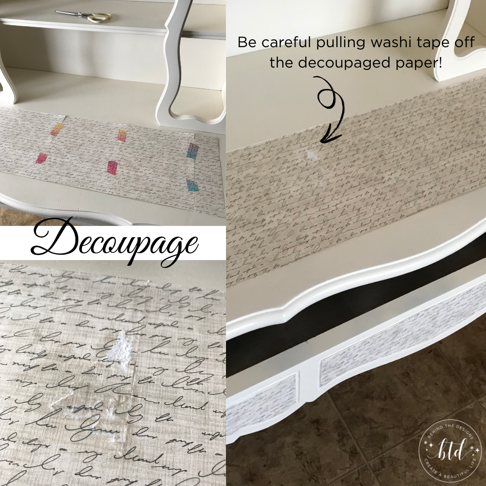 To get started on the desktop (to cover that ugly darker brown square) I used washi tape to line up the wording of the scrapbook paper. Once I lined up the paper, I put a coating of mod podge down to adhere the paper to the desk. Everything worked perfectly until…