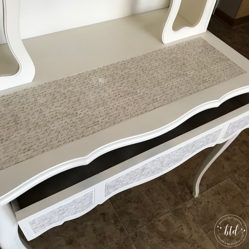I followed these same steps for the drawer front, except I had to cut out the paper to match the curves of the insets.