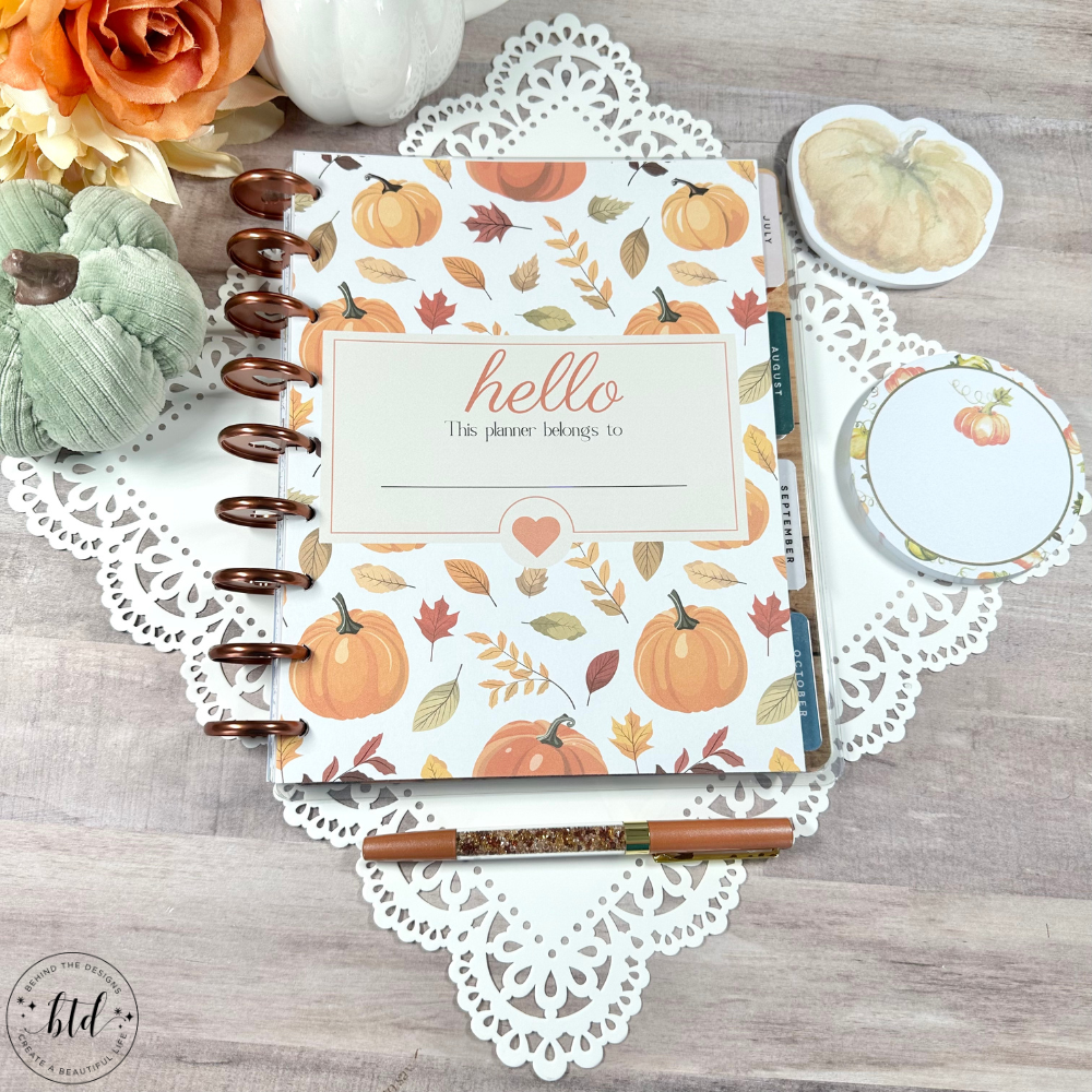 If you follow my blog you know I love (and am slightly obsessed with) the Happy Planner disc-bound system. When I decided on this autumn leaves cover style I just had to add in a sprinkling of pumpkins and that’s exactly what I did for this “hello page”. It pairs perfectly with my bronze metal discs.