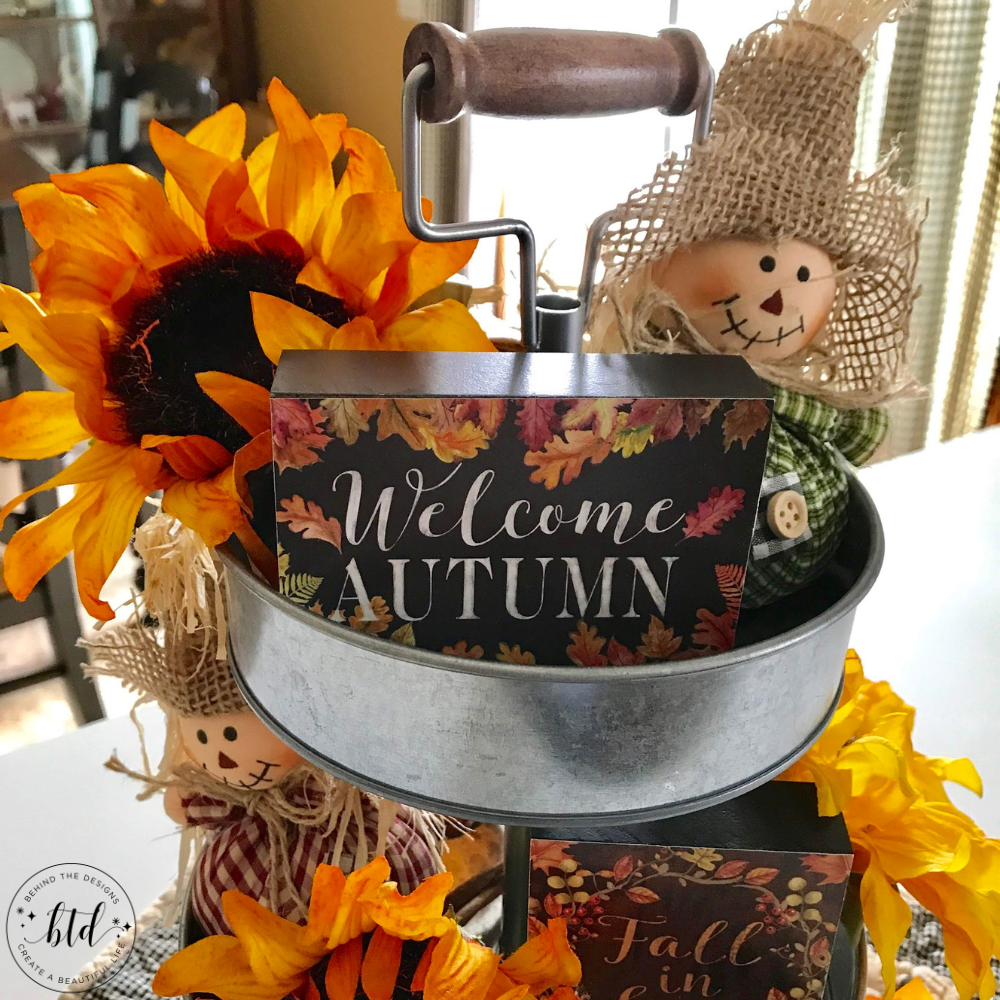 To create my fall display I chose a farmhouse style three-tiered galvanized tray with a wood handle from Hobby Lobby. It was quite easy pulling together my tiered tray theme because seasonal fall decor was already out in the stores. I think I’m going to have a lot of fun changing this tray out each season!