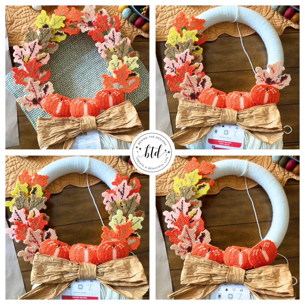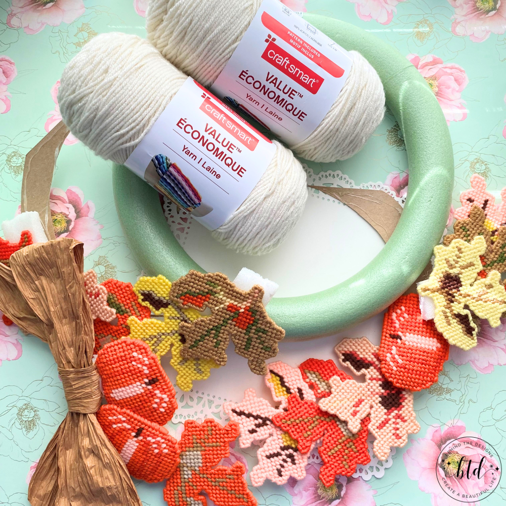 The next challenge was deciding on a yarn color that would compliment the colors that were already in the leaves and pumpkins. All the colors proved difficult to find, mostly because this wreath was at least 18-20 years old and I don’t know what brand yarn my mother had used. I settled on using an off white color yarn.