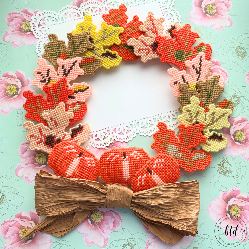 In case you hadn’t figured it out yet, I didn’t create the leaves or bow -my mother did. For the leaves she used plastic canvas as the base and various colors of yarn for the leaves. I was always in awe of my mothers’ craftiness. She could look at a yarn design and create it without even reading the instructions.